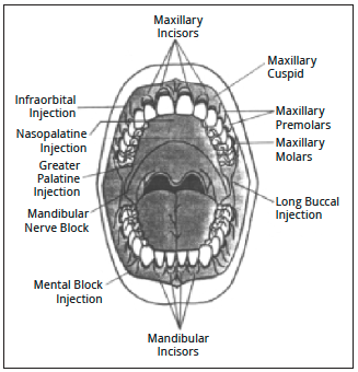 Before injection of local anesthesia, controlled aspiration must always be made. Injections should be given with as little pressure as possible. In general, fluid flow will virtually be free, while injections into the papilla and hard palate will require some pressure. The mucosa of the hard palate is tightly adapted to the periosteum. Injections should be slow with using no more force or volume of local anesthetic than is absolutely necessary.