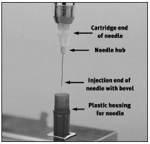 The syringe may also be assembled by placing the needle on the syringe first and then placing the cartridge into the barrel of the syringe. To prevent accidental needle-sticks from a contaminated needle, it is best that once the needle has been contaminated (used for an injection), the syringe should not be transferred from assistant to dentist. The dentist should retrieve the syringe for additional injections. The needle should also be recapped using a one-handed scoop technique. This is accomplished by sliding the needle into the needle guard, using only one hand. Needle recapping devices may also be used. In the event that a second injection is necessary, the assistant should be sure the needle guard is in place, and place a new cartridge in the syringe. The syringe is then placed on the tray for the dentist to retrieve. Once the treatment is complete, the needle should be carefully removed from the syringe with the needle guard in place, and then discarded in a sharps container. Before discarding the needle in the sharps container, check to be sure that the hub end of the syringe did not come off with the needle. The anesthetic cartridge is then removed from the syringe, and it too can be placed in the sharps container (check with local laws regarding disposal of anesthetic cartridges). The syringe must be cleaned and sterilized appropriately.