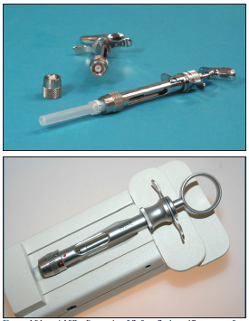 In order to properly assemble the syringe with the anesthetic cartridge and the needle, the assistant must be certain that they have assembled the correct items. Selection of the proper anesthetic solution is critical. The assistant should check the patient's record to determine the type of anesthesia to be used. The assistant must also know what area of the oral cavity will be anesthetized in order to determine the proper needle length and gauge. The dental provider should be consulted regarding both the type of anesthesia and the type of needle before the syringe is assembled.8 When the appropriate anesthetic cartridge has been chosen, it should be inspected, as described in the previous section on anesthetic cartridges. The assistant should also double-check that they have chosen the correct type of anesthesia. The syringe can then be removed from its protective wrapping, and inspected to be sure it is safe and ready for use.