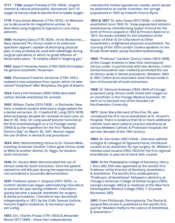 2. Reed KL. A Brief History of Anesthesiology in Dentistry. Texas Dent J 2002 Mar; 219-224. https://www.ncbi.nlm.nih.gov/pubmed/11922013. Accessed November 14, 2018