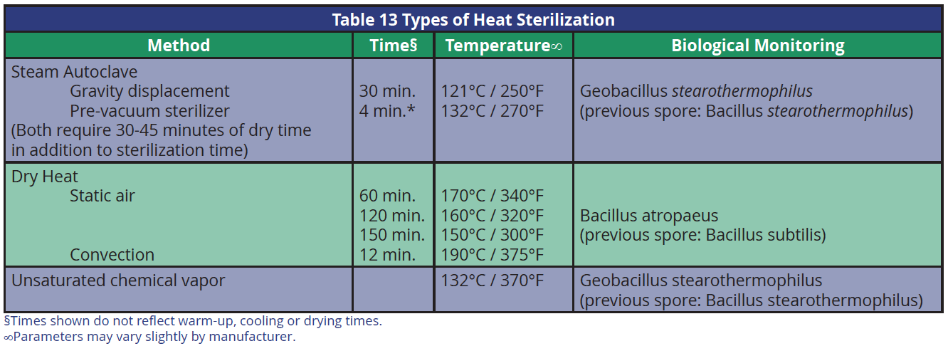 There are three major categories of heat sterilization available in dentistry. They are: steam under pressure (autoclave), unsaturated chemical vapor, and dry heat. Within these three classifications there are a few subcategories. Table 13 and Table 14 depict the types of heat sterilization used in dentistry and the times and temperatures required for sterilization. Time and temperature are for wrapped or packaged instruments. Although shorter cycles are available for unwrapped items it is inappropriate to routinely sterilize items unwrapped, since this does not allow for aseptic storage of instruments.