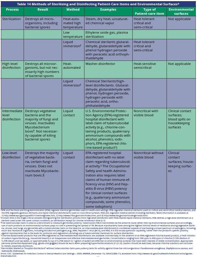 Sterilization is the terminal process used to ensure that instruments and devices that come into contact with the patient's oral tissues are free from contamination from previous patients. Not all dental instruments and equipment can withstand the heat sterilization process. There are chemical agents that achieve sterilization under the right conditions, but due to a number of factors, their use is limited and discouraged. Table 12 defines the categories of instruments, which is the first step in determining if an item must be sterilized or may be disinfected.