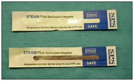Mechanical monitoring is simply observing the unit's gauges to confirm the proper times, temperatures, and pressure. (Figure 4) Chemical monitors use color changes on indicators to identify packages exposed to certain parameters, such as temperature and steam. (Figure 5) Examples of chemical monitors include autoclave tape, pouches with color-change indicators, and test strips processed in the packages of sterilized instruments. The CDC recommends chemical monitors on every package of instruments. Both of these types of indicators will tell the operator that some of the conditions necessary for sterilization were present, but they do not verify sterilization.