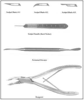 Some of the instruments that are used in periodontics are shown in Figure 2a and Figure 2b. These include the explorer, periodontal probe, curettes, and scalers (manual and ultrasonic). In addition, the periodontist may use the following instruments: