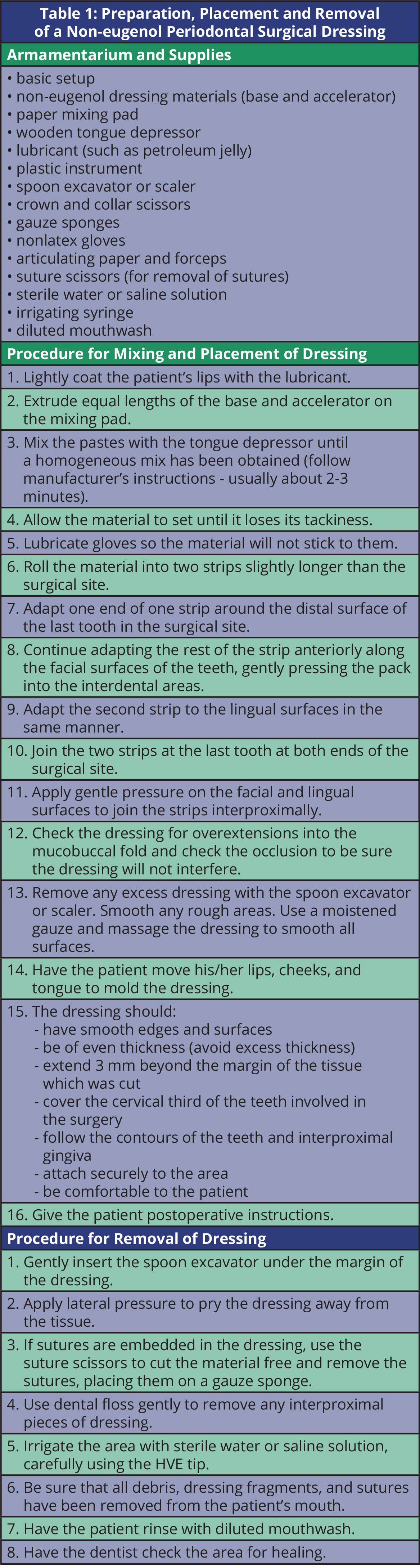 A periodontal dressing is often placed over the surgery site following the procedure (Table 1). The dressing acts as a bandage for the site, protecting the tissues from trauma during the healing process. It also helps to reduce postoperative discomfort, infection, and hemorrhage, and it helps to support mobile teeth. Depending on the state practice act, some states allow a dental assistant to place and remove a periodontal dressing. Periodontal dressings are available in three types: zinc oxide-eugenol materials, non-eugenol materials, and light-cured materials. Zinc oxide-eugenol dressing materials are supplied as a powder and liquid that can be mixed before the procedure and stored until it is needed. The eugenol in these materials may cause an allergic reaction for some patients, with redness and a burning sensation in the area. Non-eugenol materials are more commonly used because they do not produce allergic reactions. They are supplied as a two-paste system; they are dispensed in equal portions and mixed immediately prior to use. Light-cured materials are supplied in a syringe-type dispenser that requires no mixing. They can be injected directly onto the surgical site and molded into place.